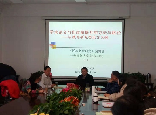 海路教授以以“教育研究类论文”为切入点,围绕我国民族教育研究的热点和重点问题,从“高质量学术论文提升的写作‘五度’”,即高度、深度、精度、细度、温度,向师生们提出论文质量提升的基本路径。进而提出选题内容追求原创、注重文献的深度、加强论述分析、注重研究方法的规范性、高度重视引文、注重人文性和政治性等多方面要求。另外,海路教授还对《民族教育研究》杂志做出了较为详细的介绍。